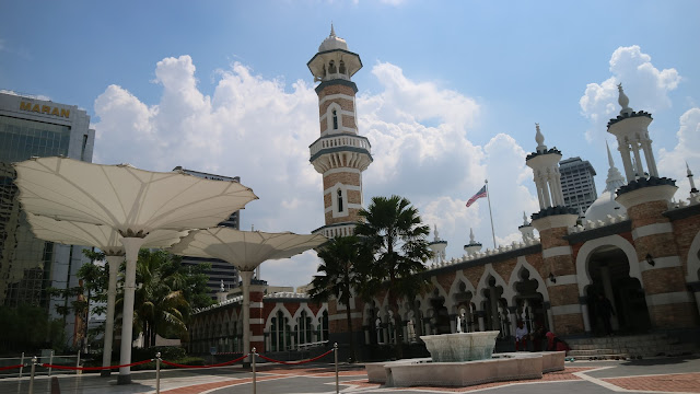 Masjid Jamek merupakan yang tertua di Kuala Lumpur. Desainnya mirip Masjid Nabawi di Mekkah, lengkap dengan deretan payung putih.